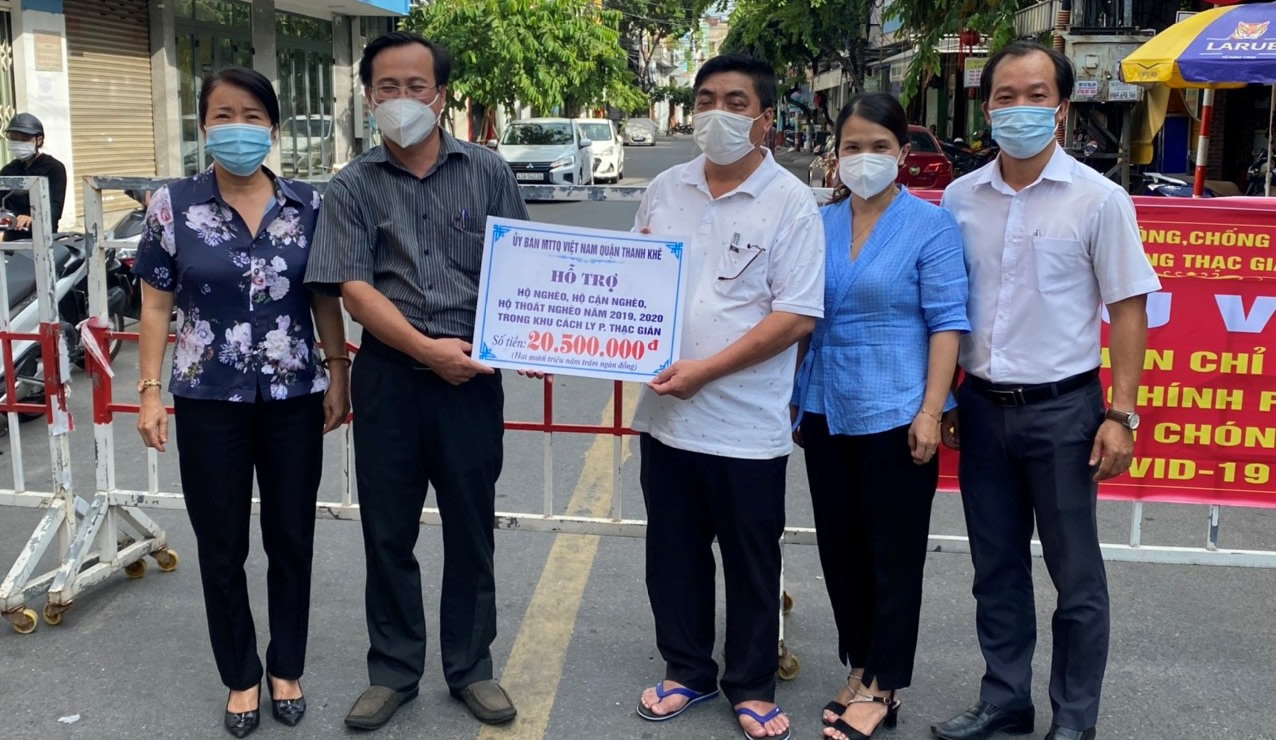 Đà Nẵng - Lãnh đạo Quận ủy, UBMTTQVN Q. Thanh Khê đã tổ chức đoàn thăm, động viên và trao tặng quà cho các hộ dân là hộ nghèo, hộ cận nghèo,... và lực lượng làm nhiệm vụ tại các khu vực phong tỏa tạm thời trên địa bàn 2 phường An Khê, Thạc Gián đang thực hiện Chỉ thị 16 của Thủ tướng Chính phủ về phòng chống dịch COVID-19. Thông qua lãnh đạo các địa phương, Phó Bí thư Thường trực Quận ủy Nguyễn Thị Minh Nguyệt, Chủ tịch UBMTTQVN quận Huỳnh Sơn Hải đã gửi lời thăm hỏi đến cán bộ, đảng viên và nhân dân 2 phường An Khê, Thạc Gián; động viên người dân cố gắng nhanh chóng vượt qua khó khăn tạm thời, thực hiện tốt các quy định phòng, chống dịch. Dịp này, Mặt trận quận trao 105,5 triệu đồng để hỗ trợ hộ nghèo, hộ cận nghèo, hộ thoát nghèo 2019, 2020 trong khu cách ly của 2 phường. Đây là hoạt động thiết thực nhằm kịp thời quan tâm, chia sẻ động viên những người dân trong khu vực phong tỏa, với tinh thần “Đoàn kết, chung tay vượt qua khó khăn, đẩy lùi dịch bệnh”.