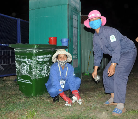 Những công nhân vệ sinh Công ty môi trường đô thị Đà Nẵng đang âm thầm với công việc nhặt rác, dọn dẹp tại các khu vệ sinh. |