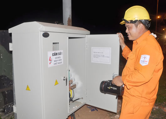 Anh Nguyễn Trường Thức, công nhân Công ty Điện lực Sơn Trà đang theo dõi an toàn dòng điện. |