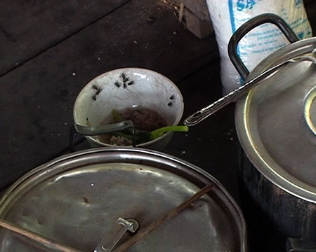 Chén cơm đầy ruồi bu trong bữa ăn của anh Trách. |