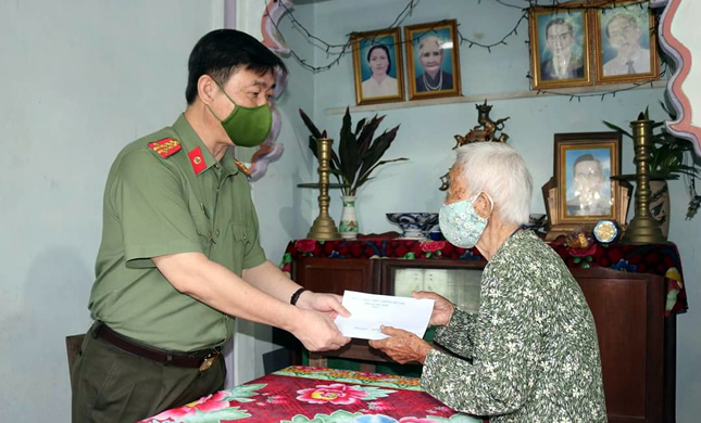 Quảng Ngãi - Nhân dịp Tết Nguyên đán Nhâm Dần 2022, sáng 13-1, Đoàn công tác của Tỉnh ủy - HĐND - UBND - Ủy ban MTTQ Việt Nam tỉnh Quảng Ngãi do đồng chí Đại tá Phan Công Bình - Ủy viên Ban Thường vụ Tỉnh ủy, Giám đốc Công an tỉnh làm trưởng đoàn đã về thăm, tặng quà Tết cho các gia đình chính sách, hộ nghèo trên địa bàn thị xã Đức Phổ.