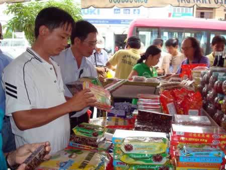Các văn nghệ sĩ Huế mua kẹo dừa ở Bến Tre. |