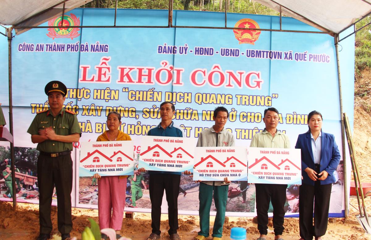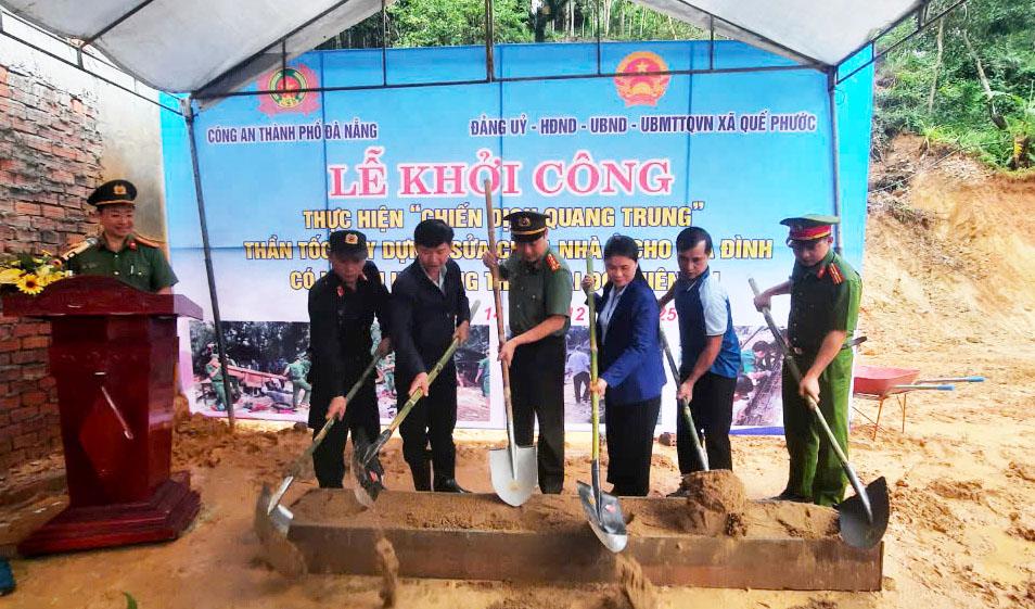 Lãnh đạo Công an TP Đà Nẵng, Trung đoàn CSCĐ Trung bộ và chính quyền xã Quế Phước thực hiện nghi Lễ khởi công xây nhà cho các hộ dân.