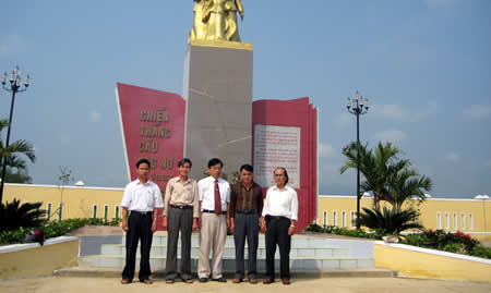 Anh Ngô Thanh Hải, cán bộ Ban An ninh Quảng Đà (giữa) cùng các cựu binh Đoàn R20 và lãnh đạo xã Đại Thắng bên Tượng đài Chiến thắng cầu Ông Nở. |