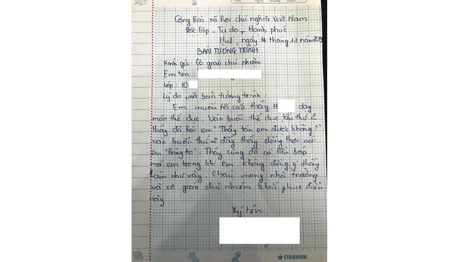 Đơn tố cáo thầy H. của nữ sinh N. gửi giáo viên chủ nhiệm. |