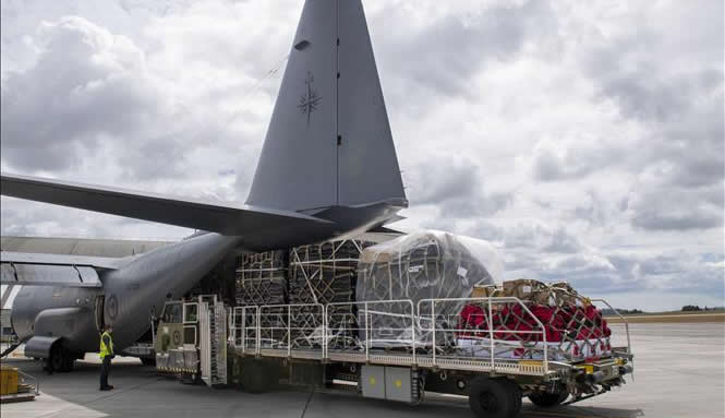 Máy bay chở hàng viện trợ của Không lực Hoàng gia New Zealand chuẩn bị rời căn cứ Auckland tới Tonga hôm 20-1. Ảnh: THX |