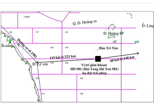 | Giàn khoan HD-981 của Trung Quốc nằm bất hợp pháp trong vùng đặc quyền kinh tế, thềm lục địa của Việt Nam. (Ảnh do Tập đoàn Dầu khí Việt Nam cung cấp). |