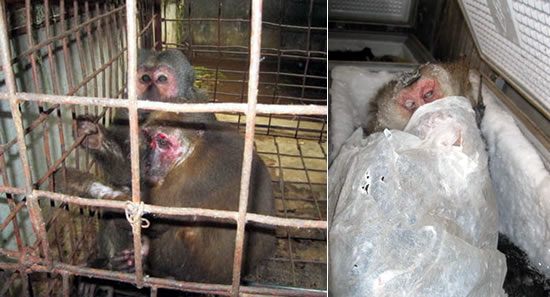 2 con khỉ này bị thợ săn bẫy được ở khu dự trữ sinh quyển miền tây Nghệ An; và những con voọc bị bắn chết được ướp lạnh. |