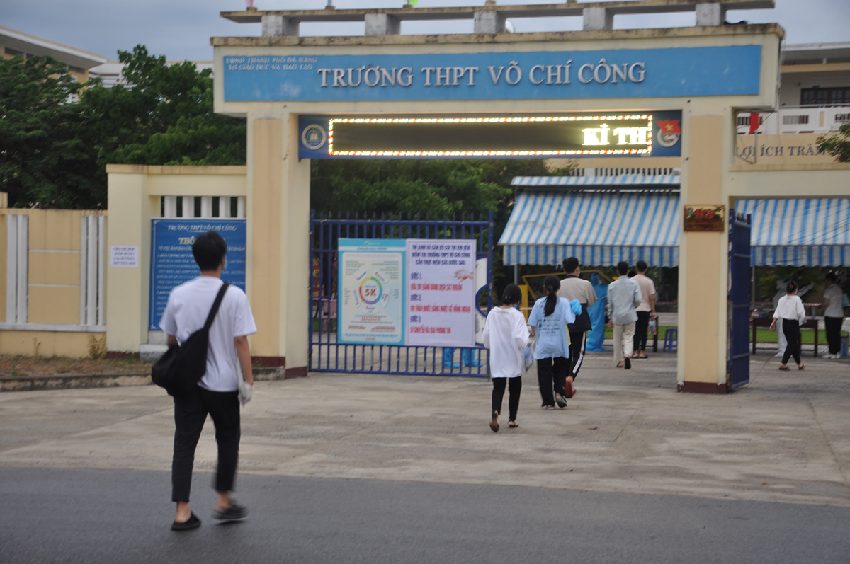 Tại điểm thi THPT Võ Chí Công, từ 6 giờ sáng, xe đưa đón TS thuộc diện các diện F (trừ F0) đã có mặt tại điểm thi. Một số TS trước khi bước xuống xe đã cởi bỏ đồ bảo hộ, thay khẩu trang để bước vào cổng điểm thi, thực hiện các quy trình sát khuẩn, đo thân nhiệt và được đưa lên phòng thi chờ cán bộ coi thi gọi tên TS vào phòng thi.