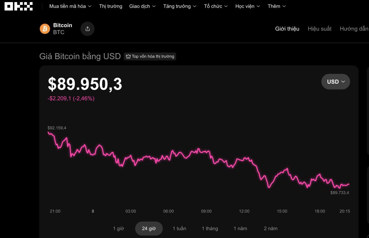 Tối 8-1, thị trường tiền số bất ngờ đảo chiều. Dữ liệu từ sàn OKX cho thấy trong 24 giờ qua, Bitcoin giảm gần 2,5%, xuống vùng 89.950 USD.