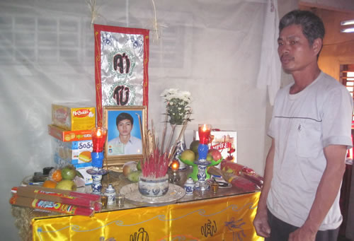 | Ông Mai Văn Quyền trước bàn thờ người con trai duy nhất. |