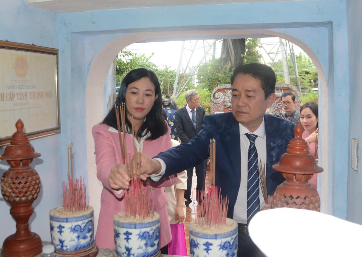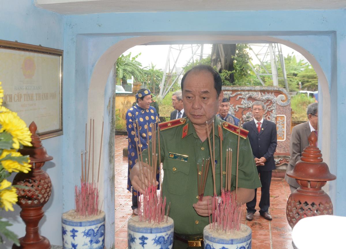Trước giờ tham gia buổi lễ, Thiếu tướng Nguyễn Hữu Hợp cùng các đại biểu đã tới dâng hương tại Miếu Tam vị của khu dân cư; thăm gian hàng OCOP và gian hàng không đồng của Khu dân cư.