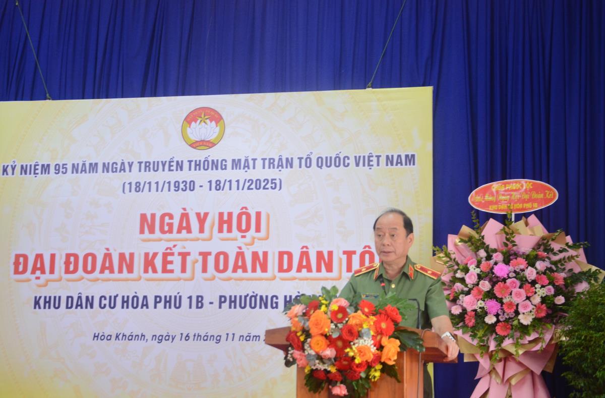 Thiếu tướng Nguyễn Hữu Hợp cho rằng, kỷ niệm 95 năm Ngày thành lập Mặt trận Dân tộc thống nhất Việt Nam (18/11/1930 - 18/11/2025), Ngày hội Đại đoàn kết toàn dân tộc năm nay càng có ý nghĩa đặc biệt hơn khi được tổ chức trong thời điểm chào mừng thành công Đại hội đại biểu lần thứ I Đảng bộ thành phố Đà Nẵng, hướng đến Đại hội đại biểu toàn quốc lần thứ 14 của Đảng. “Tôi hết sức vui mừng về những thành tích mà Đảng bộ, chính quyền và Nhân dân phường Hòa Khánh nói chung, khu dân cư Hòa Phú 1B nói riêng đã đạt được trong năm qua. Đặc biệt, cán bộ và Nhân dân khu dân cư chúng ta đã phát huy truyền thống tốt đẹp, tinh thần đoàn kết, tương thân tương ái, giúp đỡ lẫn nhau trong phát triển kinh tế với nhiều ngành nghề, biết áp dụng tiến bộ khoa học kỹ thuật vào các lĩnh vực sản xuất, kinh doanh nhằm nâng cao thu nhập, kinh tế hộ gia đình, góp phần ổn định đời sống Nhân dân; cơ sở hạ tầng được đầu tư xây dựng khang trang, làm cho khu dân cư ngày càng sáng, xanh, sạch, đẹp; công tác chăm lo cho người nghèo, cho trẻ em, học sinh có hoàn cảnh khó khăn, công tác bảo vệ môi trường, bảo vệ sức khoẻ cộng đồng được thường xuyên chú trọng” – Thiếu tướng Nguyễn Hữu Hợp nói.