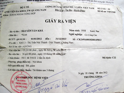 Người thứ 2 chúng tôi gặp là ông Nguyễn Tấn Khả (1958, thôn Đại Phú, xã Tam Hiệp, H. Núi Thành, Quảng Nam). 4 năm trước, ông Khả được phát hiện ung thư biểu mô tế bào gan giai đoạn đầu. Bệnh viện đã dùng phương pháp TOCE tiêm hóa chất tiêu diệt tế bào ung thư. Tuy các bác sĩ cho biết bệnh ông có thể chữa khỏi vì khối u còn nhỏ nhưng ông nghĩ đã ung thư thì cầm chắc cái chết, chạy chữa chỉ tổ tốn kém, trong khi gia đình quá khó khăn, mẹ già đau yếu, con gái bị bệnh tim đang cần nhiều tiền phẫu thuật... Nhưng ông nghĩ lại mình là trụ cột của gia đình nên không thể đầu hàng bệnh tật. Trong thời gian điều trị ở bệnh viện, ông tìm hiểu các bài thuốc nam chữa bệnh gan.