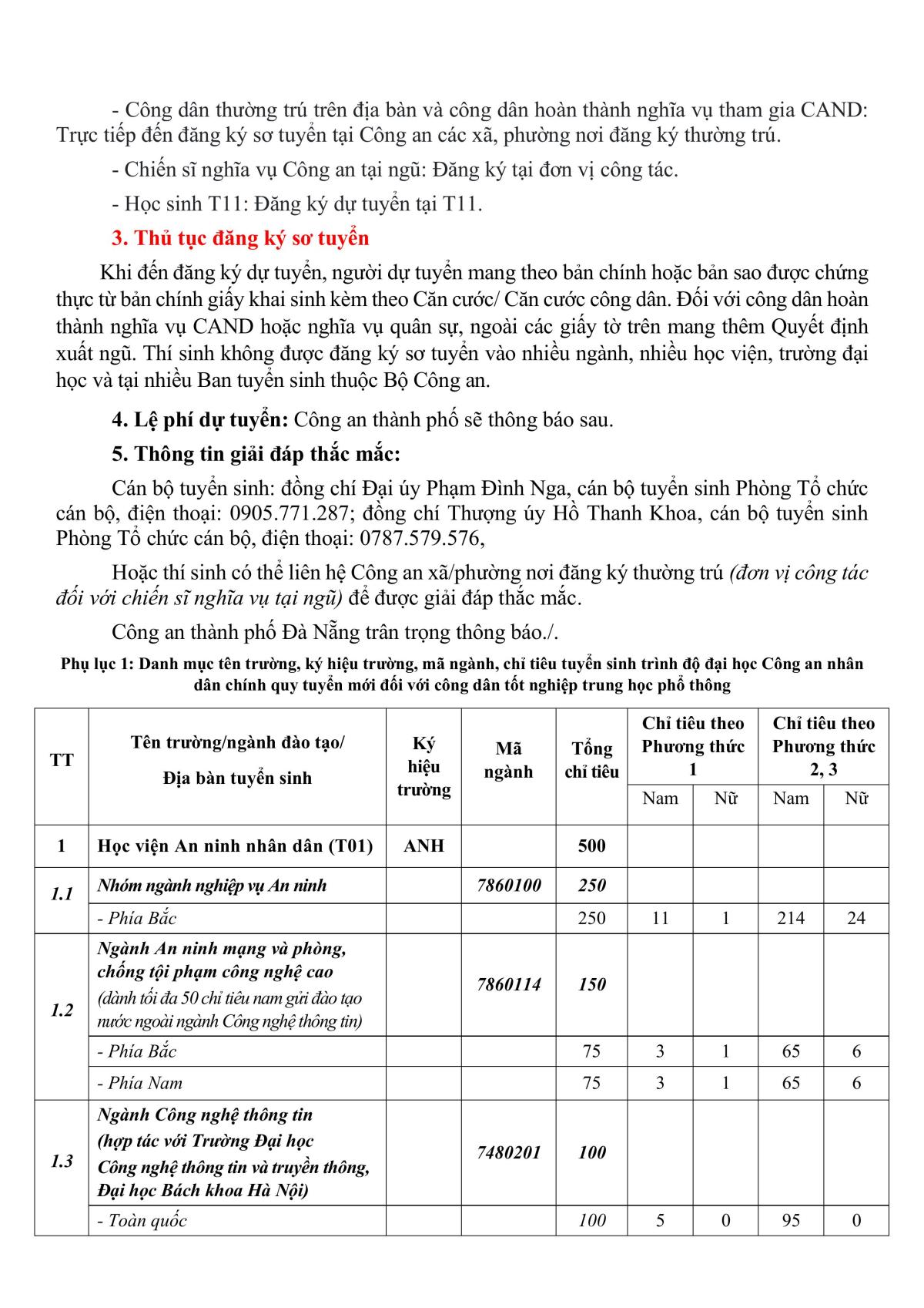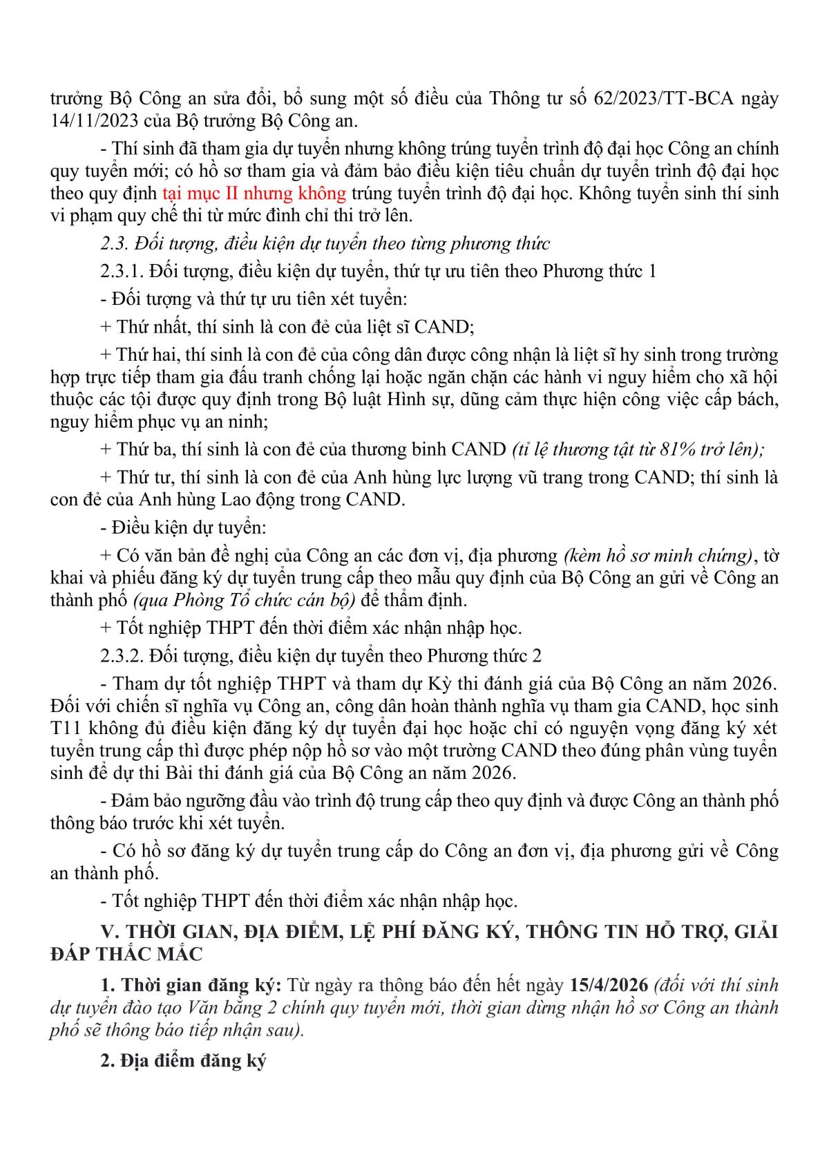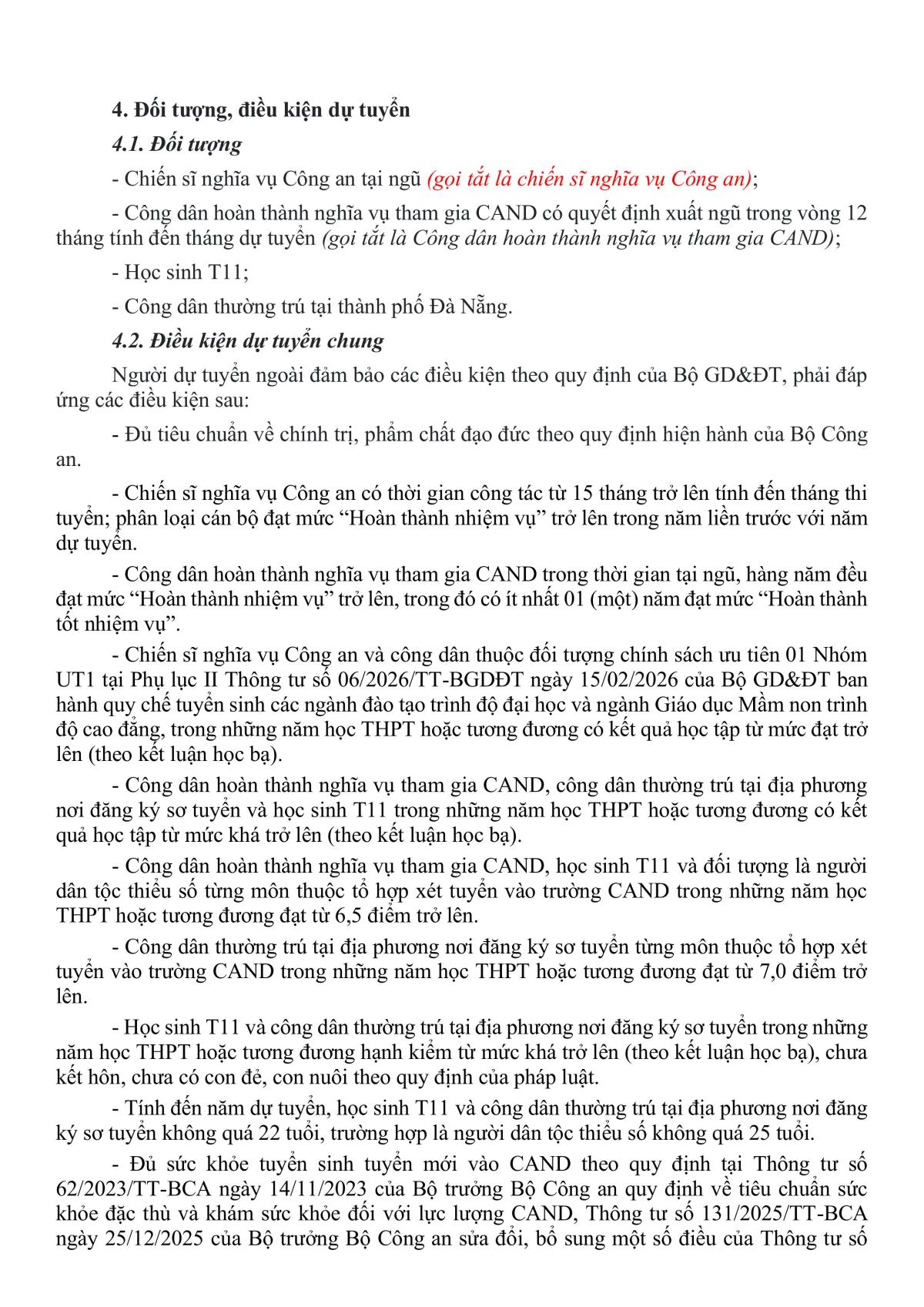 Căn cứ Thông tư số 50/2021/TT-BCA ngày 11/5/2021 của Bộ trưởng Bộ Công an quy định về tuyển sinh vào các trường Công an nhân dân (CAND) và Thông tư số 99/2025/TT-BCA ngày 28/10/2025 của Bộ trưởng Bộ Công an sửa đổi, bổ sung một số điều của Thông tư số 50/2021/TT-BCA ngày 11/5/2021 và các văn bản hướng dẫn của Bộ Công an. Công an thành phố Đà Nẵng thông tin về công tác tuyển sinh chính quy tuyển mới vào các trường CAND năm 2026 như sau: