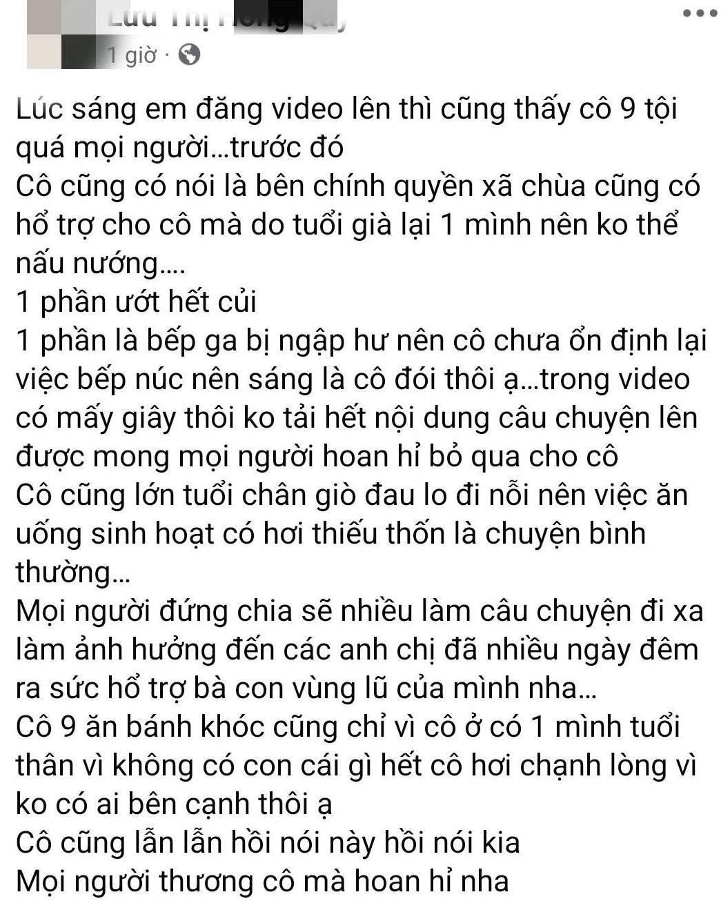 Trong 3 ngày mưa lụt, bà C. được chính quyền địa phương và các mạnh thường quân cấp phát đồ ăn, sữa, nước uống, mì tôm và các nhu yếu phẩm đảm bảo sinh hoạt. Việc chia sẻ thông tin không chính xác trên đã ảnh hưởng rất lớn đến hình ảnh của chính quyền địa phương và các lực lượng vũ trang trong công tác cứu hộ.