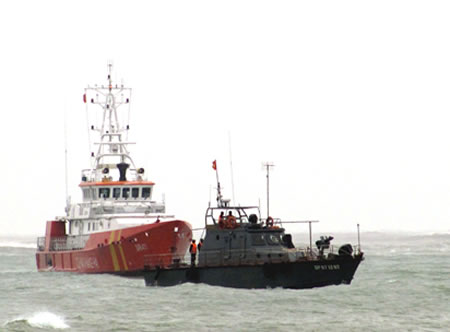 Tàu của BĐBP Quảng Bình và MRCC Hải Phòng đang nỗ lực tìm kiếm các ngư dân. |