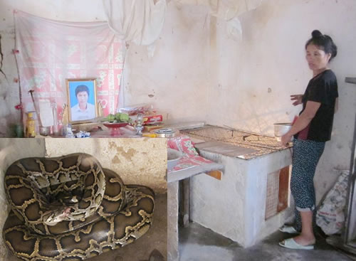 Không mấy khó khăn khi chúng tôi hỏi thăm gia đình ông Hoàng Văn Viễn và bà Lê Thị Tuyết (trú xóm 9, xã Quỳnh Mỹ). Trong căn phòng cũ, ẩm thấp là bàn thờ người con trai xấu số không may bị chết vì tai nạn lao động. Bên cạnh bàn thờ là một chuồng nhỏ nuôi một con trăn nặng khoảng 15kg, 4 bên được xây bằng gạch, bên trên được đậy bằng tấm lưới thép B40 khá kiên cố. Sau khi thắp nén nhang cho người vắn số, bà Tuyết chỉ lên di ảnh con trai nói: “Thằng H. không may bị mất trong một tai nạn lao động ở Hà Nội. Nó là con út trong gia đình có 5 anh chị em. Sau khi học hết lớp 7, H. ở nhà phụ giúp bố mẹ. Tháng giêng năm 2012, H. theo bạn đi làm phụ hồ xây dựng tại Hà Nội, khi đang làm việc thì bị tấm bê-tông rơi trúng người, thiệt mạng”.