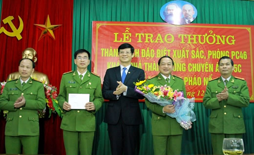 Nghệ An - Chiều 29-12, ông Lê Xuân Đại - Phó Chủ tịch UBND tỉnh Nghệ An đã tặng hoa chúc mừng và trao thưởng cho Phòng Cảnh sát Kinh tế 20 triệu đồng và Phòng CSQLHC về TTXH 10 triệu đồng. Công an tỉnh Nghệ An cũng đã quyết định trao thưởng cho 2 đơn vị, mỗi đơn vị 5 triệu đồng.