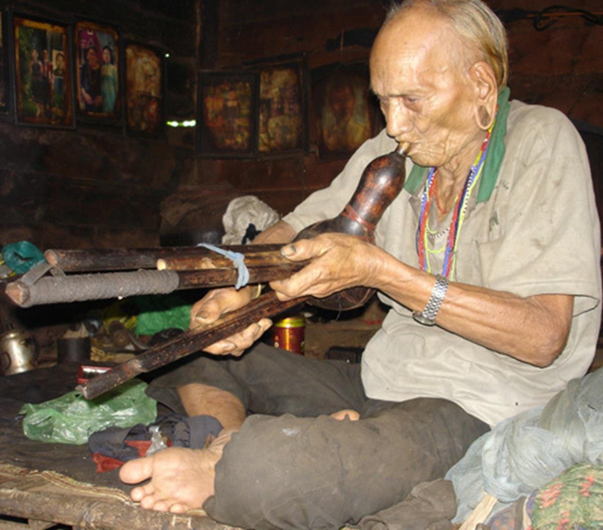 Nghệ nhân nằm trên chiếc giường thấp trong một căn nhà gỗ, nền đất khá tuềnh toàng, chung quanh treo một vài bằng khen và một gói đồ chứa đựng các nhạc cụ, giữa nhà là bếp lửa âm ỉ đỏ. Một cán bộ văn hóa địa phương giải thích: Chính quyền đã hỗ trợ xây nhà, nhà ngay bên cạnh nhưng ông lại nhường cho con gái ở, còn ông bám lấy ngôi nhà ọp ẹp này, động viên mấy cũng cứ ở đây. Nhà văn Thái Bá Lợi đứng cạnh, chỉ vào bếp lửa và nói tiếp: Đơn giản chỉ vì ông không thể xa rời bếp lửa. Mà nhà bê-tông lót gạch làm sao có bếp lửa giữa nhà!
