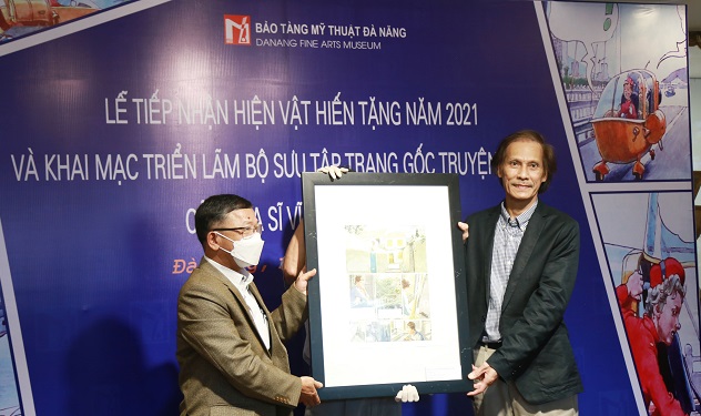 Đại diện gia đình họa sĩ Vĩnh Khoa - Vink trao tặng trang gốc truyện tranh cho Bảo tàng Mỹ thuật Đà Nẵng.