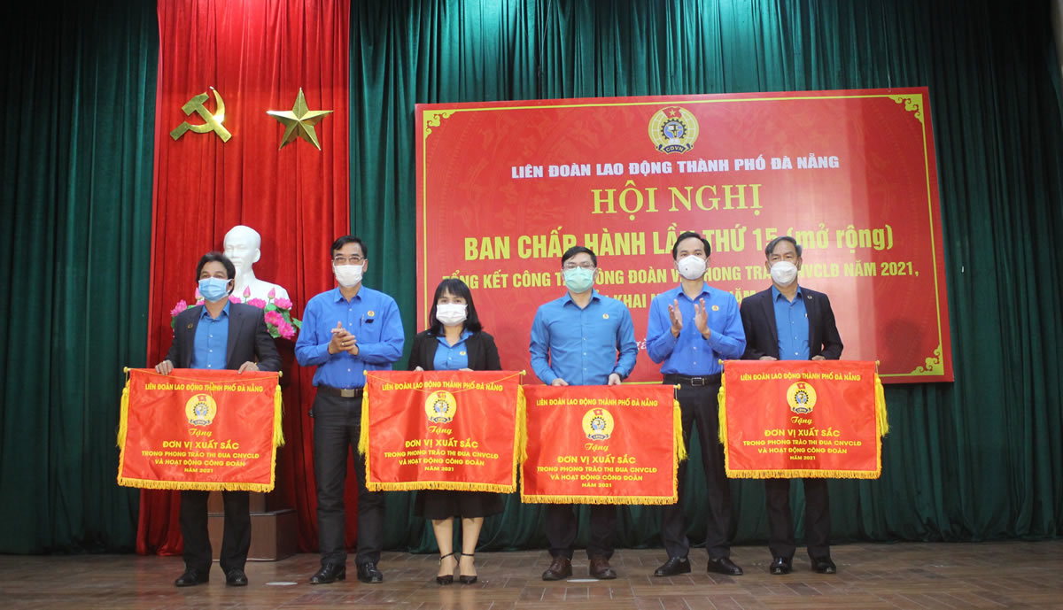 Ông Nguyễn Duy Minh - Chủ tịch LĐLĐ TP Đà Nẵng (thứ 2 từ phải sang) tặng Cờ thi đua cho các đơn vị xuất sắc năm 2021. |