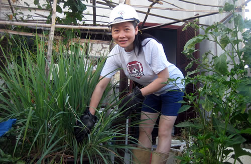 Chị Hòa đang chăm sóc vườn rau trên sân thượng. |
