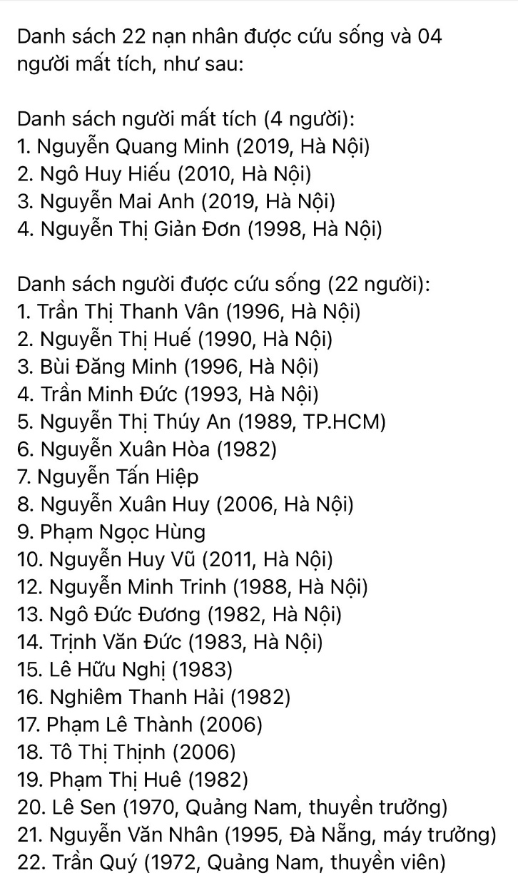 Hai người được tìm thấy là chị Nguyễn Thị Giản Đơn (1998), trú quận Hoàng Mai, Hà Nội và Ngô Minh Hiếu (2010), trú Hà Nội. Riêng 2 cháu nhỏ là Nguyễn Minh (2019) và Nguyễn Mai Anh (2019) vẫn chưa tìm thấy. Hiện lực lượng chức năng vẫn đang nỗ lực tìm kiếm cháu nhỏ còn lại. Như vậy trong vụ lật ca nô đã xác định được 15 người tử vong. Trong sáng nay, lực lượng chức năng sẽ tổ chức đưa chiếc ca nô bị nạn đang mắc cạn trên cồn cát giữa biển vào bờ để tiến hành khám nghiệm, điều tra làm rõ nguyên nhân xảy ra sự cố.