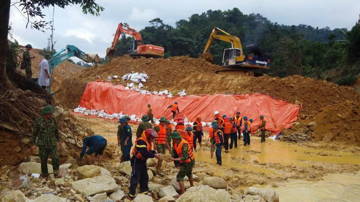 Thi công đập ngăn nắn dòng Thủy điện Rào Trăng 3 phục vụ công tác tìm kiếm nạn nhân mất tích. |