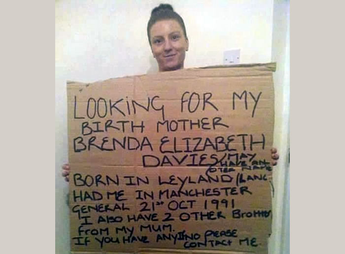 Tuy nhiên, bạn trai Stacey khuyến khích cô tạo ra bảng thông báo làm bằng bìa cứng với tên mẹ cô và các chi tiết như ngày tháng năm sinh và bệnh viện nơi cô sinh ra và đăng lên facebook. 20 giờ sau đó, Stacey nhận được liên kết lạ từ bà Brenda và hai mẹ con họ gặp nhau tại quán rượu ở Blackpool, Lancashire (Anh).