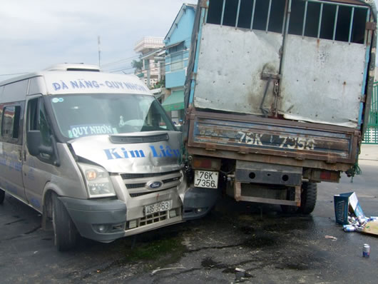 QUẢNG NGÃI- Do phóng nhanh vượt ẩu để giành khách, xe khách hiệu Kim Liên mang BKS 43S-3563 do tài xế Huỳnh Văn Thi (35 tuổi, trú H. Hoài Ân, Bình Định) điều khiển lưu thông trên QL1A (đoạn qua xã Phổ Văn, H. Đức Phổ) đã va vào phía sau ô-tô tải BKS 76K-7356 do tài xế Nguyễn Văn Bảy (56 tuổi, trú xã Đức Thạnh, H. Mộ Đức) đang qua đường. Hậu quả, bà Nguyễn Thị Hiến (70 tuổi, trú tỉnh Bình Định) đi trên xe khách bị thương. Hai ô-tô bị hư hỏng nặng.