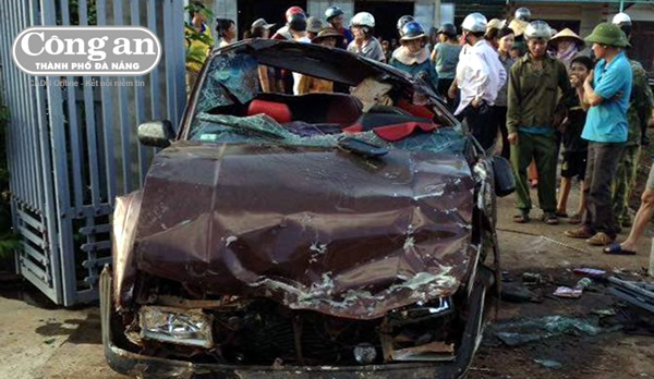 | Chiếc ô-tô bị biến dạng sau khi tông vào nhà dân. |