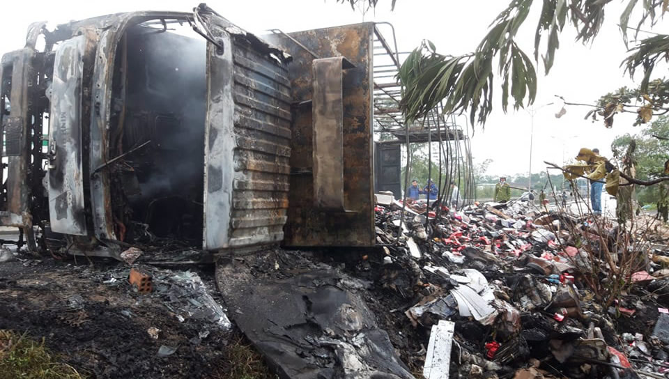 Ô-tô tải bị thiêu rụi sau khi đâm vào dải phân cách. |