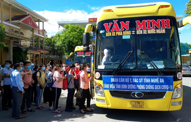 Đoàn 60 cán bộ y tế Nghệ An lên xe đi chống dịch ở Bình Dương. Ngày 28-7, Sở Y tế Nghệ An tổ chức Lễ xuất quân cho 60 y, bác sĩ lên đường hỗ trợ tỉnh Bình Dương phòng chống dịch COVID-19. Đây là lần thứ 5, Nghệ An cử các đoàn nhân viên y tế tăng cường đến vùng hỗ trợ công tác phòng, chống dịch. Trước đó, Nghệ An đã cử đoàn y, bác sĩ đến Đà Nẵng, Hà Tĩnh, TP HCM. Thời gian các y, bác sỹ tham gia hỗ trợ công tác chống dịch tại Bình Dương lần này bắt đầu từ ngày 28-7 cho đến khi có chỉ đạo mới của Bộ Y tế... Nhiệm vụ cụ thể của các thành viên đoàn do Ban Chỉ đạo phòng, chống dịch COVID-19 Bộ Y tế và tỉnh Bình Dương phân công. Ông Bùi Đình Long, Phó Chủ tịch UBND tỉnh Nghệ An ghi nhận, biểu dương tinh thần xung kích vào tâm dịch của các y, bác sĩ, đồng thời đề nghị đoàn cán bộ, y, bác sĩ tình nguyện chi viện cho tỉnh Bình Dương chấp hành nghiêm sự phân công, phân việc tại đơn vị mới. Dương Hóa |