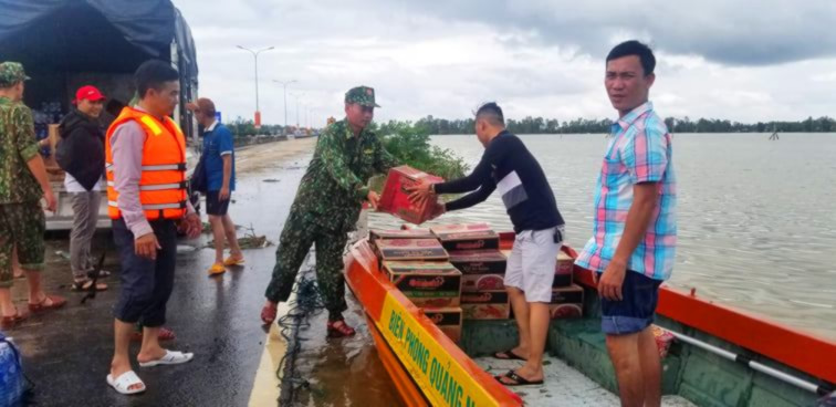 Lực lượng BĐBP tỉnh phối hợp với các tổ chức, cá nhân kịp thời đến thăm hỏi, trao tặng nhu yếu phẩm cho bà con vùng lũ xã Bình An (H. Thăng Bình). |