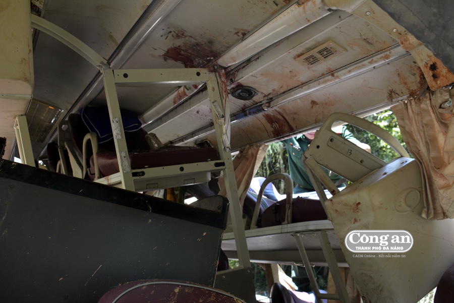 Bên trong xe khách các khung sắt bị gãy, gập với nhiều vết máu của nạn nhân. |