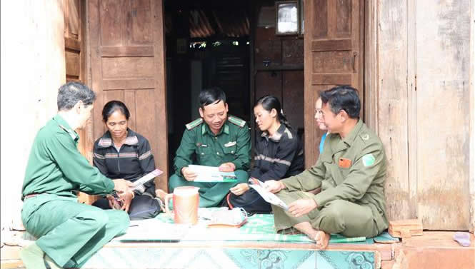 Các đảng viên Bộ đội biên phòng tỉnh Gia Lai cùng chi bộ thôn, làng đến tận nhà tuyên truyền chính sách pháp luật cho người dân. |
