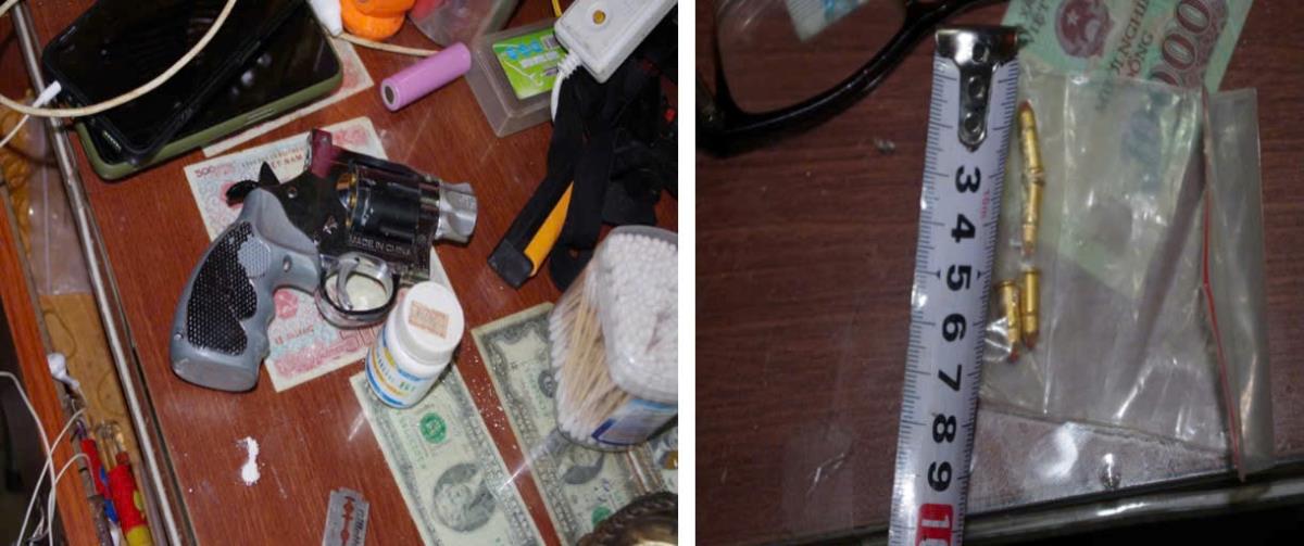 Ngay sau đó, lực lượng Công an tiếp tục bắt giữ Lê Văn Hà và khám xét nơi ở của đối tượng.Tại đây, lực lượng Công an thu giữ tang vật gồm gần 1,5 bánh heroin (443,06 g), một khẩu súng Rulo với 10 viên đạn, một bình xịt hơi cay, hơn 428 triệu đồng cùng nhiều tang vật khác.