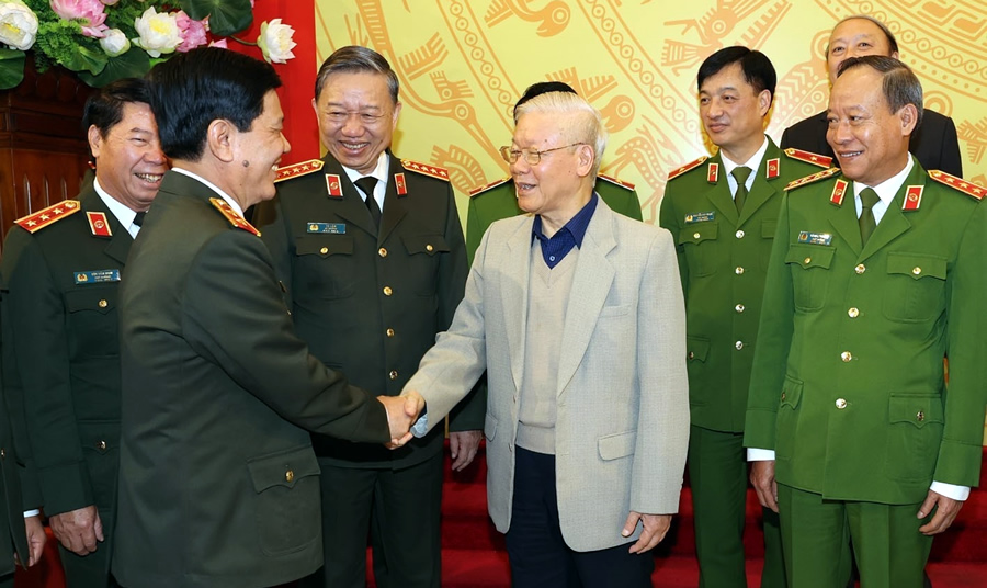 "Riêng ngành Công an, phải nói là 1 năm rất đáng tự hào, để lại dấu ấn tốt. Vấn đề quan trọng là bây giờ chúng ta phải đi sâu phân tích thêm nguyên nhân vì sao đạt được điều đó. Nguyên nhân đến từ chủ trương, nguyên nhân từ sự lãnh đạo, chỉ đạo, hay đoàn kết, có sự phân công kiểm tra, phối hợp,..." - Tổng Bí thư, Chủ tịch nước nhấn mạnh, đồng thời đề nghị Đảng ủy Công an Trung ương tổng kết sâu sắc hơn về vấn đề này.