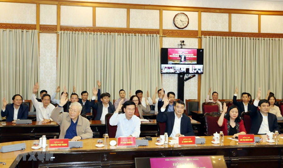 Tổng Bí thư, Chủ tịch nước Nguyễn Phú Trọng và các đại biểu biểu quyết tại hội nghị. |