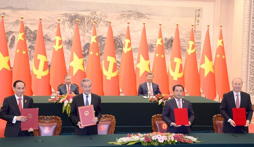 Sau hội đàm, hai đồng chí Tổng Bí thư, Chủ tịch nước đã cùng chứng kiến Lễ ký kết các văn bản thỏa thuận hợp tác trên các lĩnh vực hợp tác kênh Đảng, công an, tư pháp, kinh tế, khoa học công nghệ, chuỗi sản xuất, chuỗi cung ứng, dân sinh, truyền thông và địa phương, thể hiện thành quả toàn diện mà hai bên đạt được trong chuyến thăm.