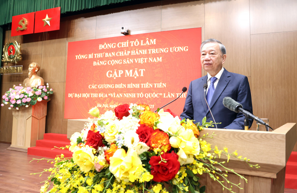 Nhân kỷ niệm 80 năm Ngày truyền thống lực lượng CAND và 20 năm Ngày hội toàn dân bảo vệ an ninh Tổ quốc, cũng là dịp nhìn nhận lại phong trào thi đua "Vì an ninh Tổ quốc", Tổng Bí thư Tô Lâm chúc mừng những chiến công, thành tích các điển hình tiên tiến đã đạt được, mà cao nhất là niềm tin của nhân dân, niềm tin của lãnh đạo Đảng, Nhà nước, đồng thời mong muốn lực lượng CAND sẽ phát huy hơn nữa, khi mà 80 năm CAND chúng ta đã trưởng thành, nhìn nhận được rất nhiều bài học, kinh nghiệm; 20 năm Ngày hội toàn dân bảo vệ an ninh Tổ quốc chúng ta nhận được sự đồng tình, ủng hộ, đóng góp của nhân dân. "Mong thi đua đi vào công việc hằng ngày của từng người, để mỗi người đều có sáng kiến, hành động đóng góp chung vào thành tích, kết quả chung của đất nước, của lực lượng CAND, của đơn vị, địa phương mình", Tổng Bí thư bày tỏ.