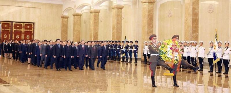 Trưa cùng ngày, Tổng Bí thư Tô Lâm cùng Đoàn đại biểu cấp cao Việt Nam đã đến Cung Thái Dương Kumsusan đặt hoa tưởng nhớ Chủ tịch Kim Nhật Thành và Tổng Bí thư Kim Jong Il.