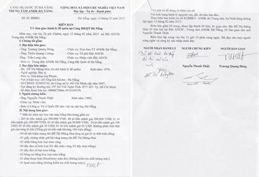 | Biên bản trao trả tài sản cho chị Hoa bị thất lạc tại sân bay. |
