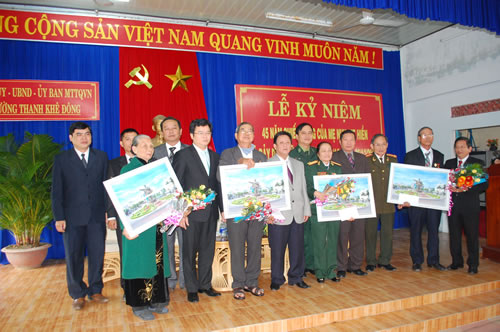 | Tặng quà lưu niệm cho các nhân chứng lịch sử tại buổi giao lưu. |