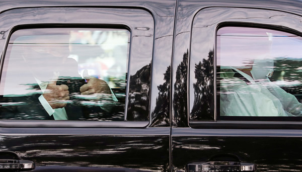 Người ủng hộ ông Trump đã reo hò chào mừng nồng nhiệt khi nhìn thấy ông xuất hiện trong chiếc xe SUV chống đạn. Ông Trump có đeo khẩu trang khi ngồi trong xe. Trước khi thực hiện chuyến đi, ông Trump đã đăng một video dài 73 giây lên Twitter cho biết ông sẽ dành một bất ngờ nhỏ cho người ủng hộ và gọi họ là “những người yêu nước vĩ đại”. Sự xuất hiện chớp nhoáng của Tổng thống Trump lập tức gây bão dư luận với không ít người khen ngợi và cũng nhiều người chỉ trích. Chủ tịch đảng Brexit của Anh, ông Nigel Farage ca ngợi Tổng thống Trump trên Twitter: “Không có nhà lãnh đạo phương Tây nào đến chào đám đông trong lúc nằm viện như ông ấy”, thêm rằng “ông ấy sẽ ra viện và khỏe mạnh hơn bao giờ hết”. Tuy nhiên, một bác sĩ từ bệnh viện nơi Trump đang điều trị đã hết lời chỉ trích hành động của nhà lãnh đạo Mỹ, gọi chuyến đi này là “điên rồ”. Vị bác sĩ này cho rằng. Tổng thống đã ra lệnh cho các vệ sĩ của mình “mạo hiểm tính mạng vì một màn kịch”.