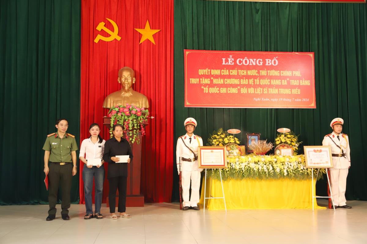 Sáng 19-7, Công an tỉnh Hà Tĩnh tổ chức Lễ công bố quyết định của Chủ tịch nước và Thủ tướng Chính phủ về việc Truy tặng Huân chương Chiến công hạng Ba và Bằng Tổ quốc ghi công đối với liệt sĩ Trần Trung Hiếu, cán bộ Công an xã Xuân Hồng, huyện Nghi Xuân, tỉnh Hà Tĩnh đã hy sinh trong khi làm nhiệm vụ.