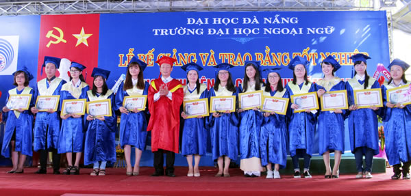 (Cadn.com.vn) - ĐÀ NẴNG - Sáng 7-7, Trường Đại học Ngoại ngữ thuộc Đại học Đà Nẵng tổ chức lễ bế giảng và trao bằng tốt nghiệp cho các sinh viên (SV) hệ chính quy năm 2015. Theo đó, có 1.229 SV được nhận bằng tốt nghiệp cử nhân, trong đó có 31 SV đạt loại xuất sắc, 229 SV đạt loại giỏi, 867 SV đạt loại khá. Đặc biệt, có 3 tân cử nhân là lưu học sinh nước ngoài gồm: Lào: 2, Hàn Quốc: 1. Đây là tỉ lệ tốt nghiệp cao nhất từ trước đến nay của Trường Đại học Ngoại ngữ.