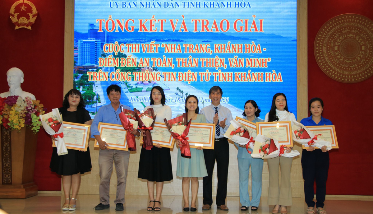 KHÁNH HÒA- Tại Nha Trang vừa diễn ra Lễ trao giải cuộc thi: Nha Trang- Khánh Hòa- Điểm đến an toàn, thân thiện, văn minh trên Công thông tin điện tử Khánh Hòa. Sau 4 tháng phát động, cuộc thi đã nhận được 522 tác phẩm dự thi, có 508 tác phẩm trong tỉnh và 9 tác phẩm ngoài tỉnh. Nhiều địa phương đã tổ chức phát động viết bài tham gia. Trong buổi lễ, đã công bố và trao giải gồm 1 giải Nhất, 2 giải Nhì, 3 giải Ba và 10 giải Khuyến khích.
