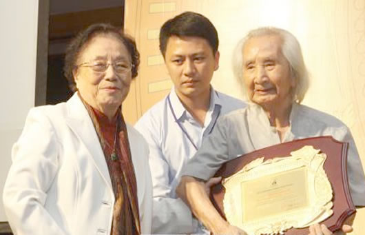 Bà Nguyễn Thị Bình, Chủ tịch Quỹ văn hóa Phan Châu Trinh, nguyên Phó Chủ tịch nước trao giải thưởng Phan Châu Trinh cho nhạc sĩ Nguyễn Vĩnh Bảo. Ảnh: TTXVN |